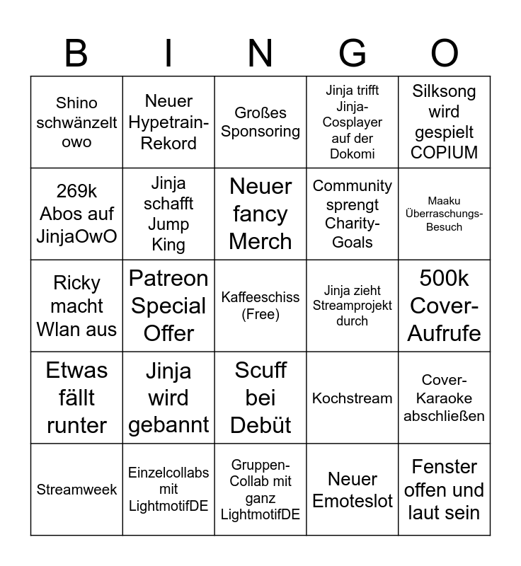 This bingo card has a free space and 24 words: Jinja wird gebannt, Einzelcollabs mit LightmotifDE, Neuer fancy Merch, Streamweek, Silksong wird gespielt COPIUM, Shino schwänzelt owo, 269k Abos auf JinjaOwO, Neuer Hypetrain-Rekord, Jinja zieht Streamprojekt durch, Scuff bei Debüt, Community sprengt Charity-Goals, Ricky macht Wlan aus, Kochstream, Cover-Karaoke abschließen, Jinja schafft Jump King, Neuer Emoteslot, 500k Cover-Aufrufe, Großes Sponsoring, Maaku Überraschungs-Besuch, Patreon Special Offer, Fenster offen und laut sein, Etwas fällt runter, Jinja trifft Jinja-Cosplayer auf der Dokomi and Gruppen-Collab mit ganz LightmotifDE.