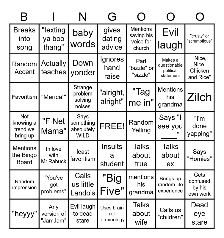 This bingo card has a free space and 48 words: mentions his grandma, Makes a questionable political statement, Uses brain rot terminology, "F Net Mama", Strange problem solving noises, "I'm done yapping", "texting ya boo thang", Any version of "JamJam", Evil laugh, Insults a student, "crusty" or "scrumptious", gives dating advice, Mentions his grandma, "Tag me in", Random impression, Says "I see you ____", Random Accent, "Nice, Nice, Chicken and Rice", Brings up random life experience, Mentions saving his voice for church, Part "bizzle" or "sizzle", Says something absolutely WILD, Breaks into song, Actually teaches, Gets confused by his own work, Down yonder, Zilch, "heyyy", "alright, alright", "Merica!", Calls us "children", Random Yelling, Says "Homies", "You've got problems", Not knowing a trend we bring up, Talks about true, Talks about ex, Favoritism, least favoritism, Calls us little Lando's, Mentions the Bingo Board, Dead eye stare, baby words, Evil laugh to dead stare, Ignores hand raise, "Big Five", In love with Mr.Rabuck and Talks about wife.