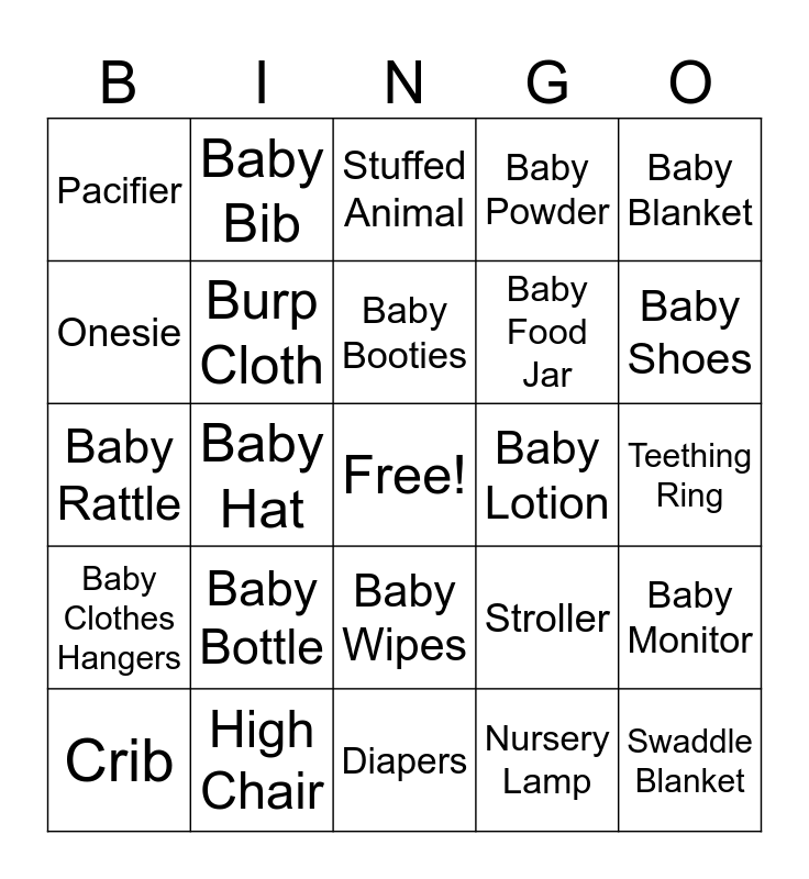 This bingo card has a free space and 25 words: Baby Bottle, Diapers, Baby Booties, Crib, Baby Blanket, Pacifier, Onesie, Baby Bib, Baby Lotion, Baby Wipes, Baby Food Jar, Baby Rattle, Stroller, Baby Monitor, Burp Cloth, Baby Shower Cake, Teething Ring, Stuffed Animal, Baby Shoes, Baby Hat, Swaddle Blanket, High Chair, Baby Clothes Hangers, Baby Powder and Nursery Lamp.
