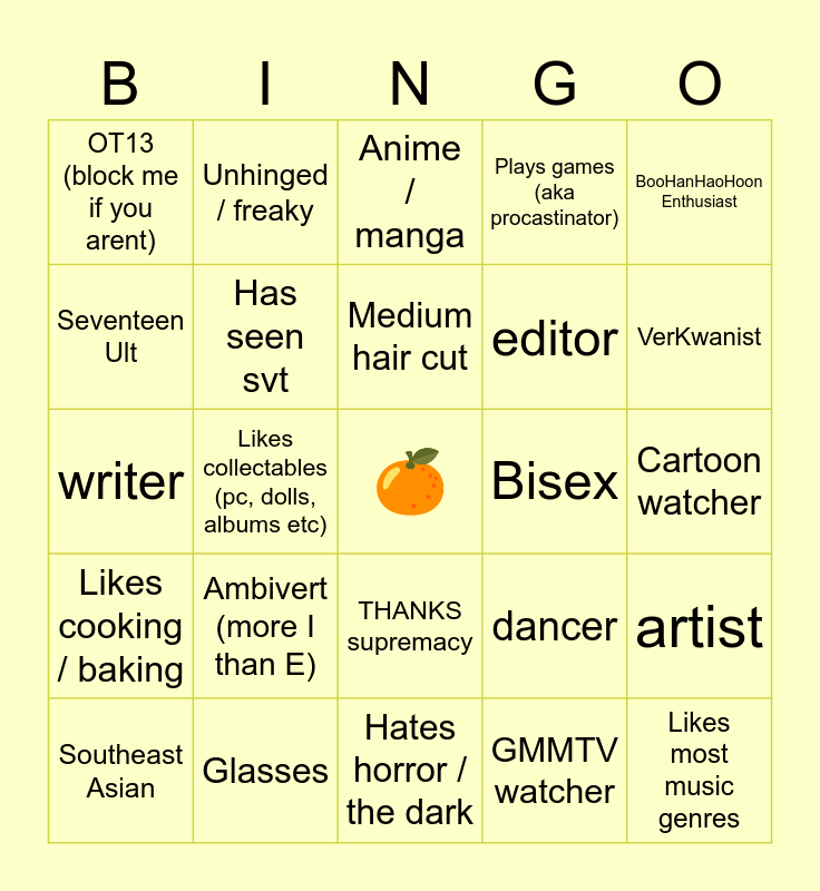 This bingo card has a free space and 24 words: Ambivert (more I than E), Glasses, Medium hair cut, Southeast Asian, BooHanHaoHoon Enthusiast, OT13 (block me if you arent), Seventeen Ult, Unhinged / freaky, Bisex, THANKS supremacy, editor, writer, dancer, artist, Has seen svt, GMMTV watcher, Cartoon watcher, Anime / manga, VerKwanist, Likes collectables (pc, dolls, albums etc), Likes most music genres, Likes cooking / baking, Plays games (aka procastinator) and Hates horror / the dark.