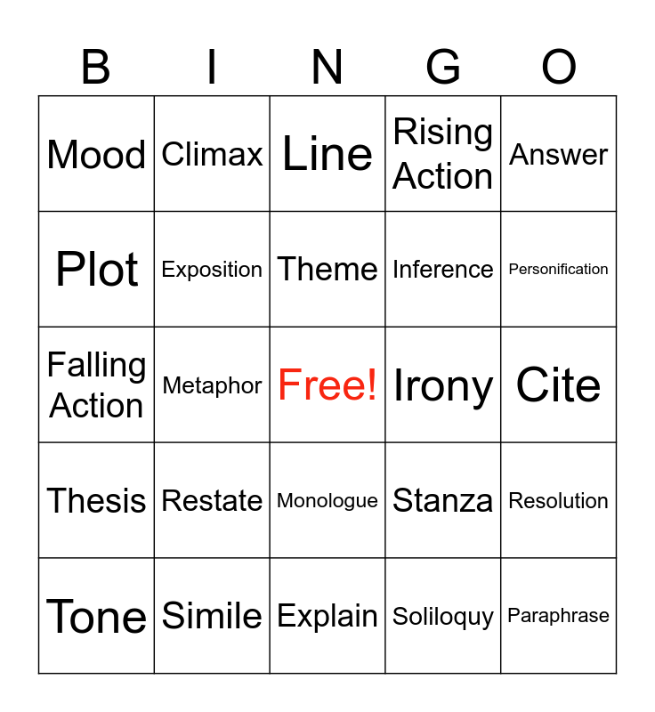 This bingo card has a free space and 24 words: Restate, Simile, Theme, Tone, Answer, Mood, Plot, Climax, Irony, Monologue, Inference, Falling Action, Stanza, Resolution, Exposition, Soliloquy, Cite, Line, Personification, Metaphor, Paraphrase, Thesis, Rising Action and Explain.