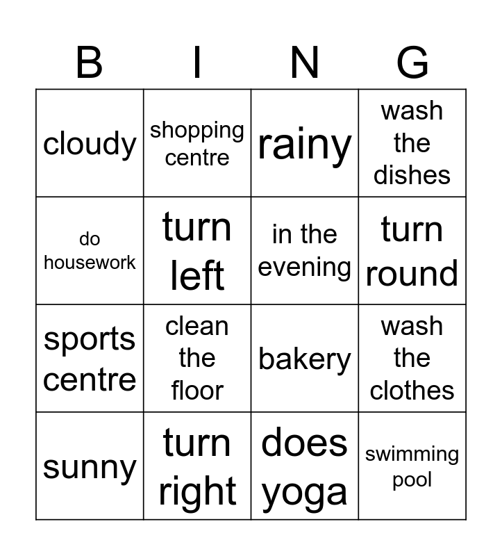 This bingo card has 17 words: does yoga, sunny, rainy, cloudy, clean the floor, wash the dishes, wash the clothes, in the evening, turn round, turn left, turn right, bakery, do housework, shopping centre, sports centre, cinema and swimming pool.