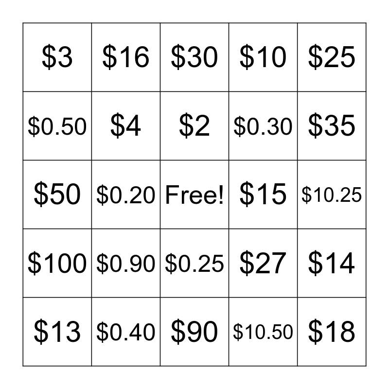This bingo card has a free space and 35 words: $20, $1, $2.25, $4, $0.25, $10, $0.50, $0.10, $2, $1.50, $50, $25, $12, $0.15, $3, $15, $10.50, $0.20, $100, $18, $27, $13, $14, $0.40, $30, $35, $40, $200, $0.30, $10.25, $19, $90, $0.90, $16 and $60.