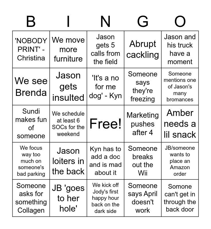 This bingo card has a free space and 24 words: Jason loiters in the back, JB 'goes to her hole', 'It's a no for me dog' - Kyn, Someone asks for something Collagen, Jason and his truck have a moment, 'NOBODY PRINT' - Christina, We see Brenda, We move more furniture, Marketing pushes after 4, Kyn has to add a doc and is mad about it, Someone says they're freezing, Sundi makes fun of someone, Someone breaks out the Wii, JB/someone wants to place an Amazon order, Jason gets insulted, Someone says April doesn't work, Amber needs a lil snack, Jason gets 5 calls from the field, Someone mentions one of Jason's many bromances, We schedule at least 6 SOCs for the weekend, Somone can't get in through the back door, We focus way too much on someone's bad parking, Abrupt cackling and We kick off Jody's first happy hour back on the dark side.