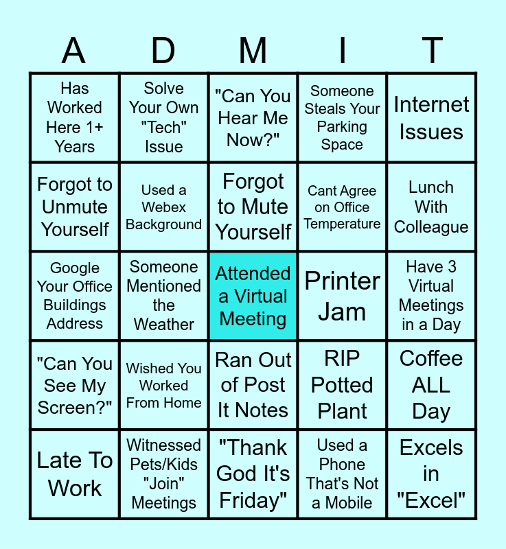 This bingo card has a free space and 24 words: Wished You Worked From Home, Witnessed Pets/Kids "Join" Meetings, Forgot to Mute Yourself, Late To Work, Internet Issues, Has Worked Here 1+ Years, Forgot to Unmute Yourself, Solve Your Own "Tech" Issue, Printer Jam, Ran Out of Post It Notes, Cant Agree on Office Temperature, Google Your Office Buildings Address, RIP Potted Plant, Coffee ALL Day, Used a Webex Background, Used a Phone That's Not a Mobile, Have 3 Virtual Meetings in a Day, "Can You Hear Me Now?", Lunch With Colleague, Someone Mentioned the Weather, Excels in "Excel", "Can You See My Screen?", Someone Steals Your Parking Space and "Thank God It's Friday".