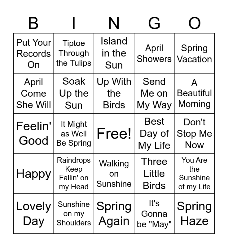 This bingo card has a free space and 35 words: Here Comes the Sun, I Can See Clearly Now, Pocket Full of Sunshine, Soak Up the Sun, Walking on Sunshine, April Showers, April Come She Will, April In Paris, Up With the Birds, Mr. Blue Sky, Feelin' Good, Spring Vacation, Beautiful Day, Sunrise, Put Your Records On, Best Day of My Life, It's Gonna be "May", It Might as Well Be Spring, Happy, Spring Haze, Three Little Birds, Lovely Day, You Are the Sunshine of my Life, Sunshine on my Shoulders, Island in the Sun, A Beautiful Morning, Can't Stop the Feelin', Spring Affair, Send Me on My Way, Don't Stop Me Now, On the Sunny Side of the Street, Spring Again, Raindrops Keep Fallin' on my Head, Tiptoe Through the Tulips and Spring Fever.