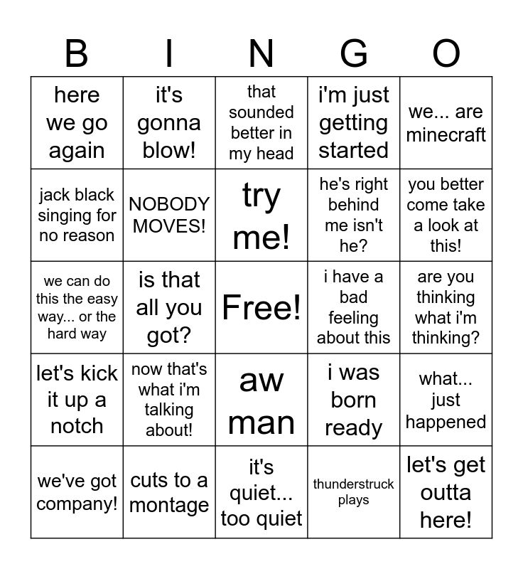 This bingo card has a free space and 24 words: now that's what i'm talking about!, cuts to a montage, try me!, we've got company!, we... are minecraft, here we go again, jack black singing for no reason, it's gonna blow!, i have a bad feeling about this, aw man, he's right behind me isn't he?, we can do this the easy way... or the hard way, i was born ready, what... just happened, NOBODY MOVES!, thunderstruck plays, are you thinking what i'm thinking?, that sounded better in my head, you better come take a look at this!, is that all you got?, let's get outta here!, let's kick it up a notch, i'm just getting started and it's quiet... too quiet.