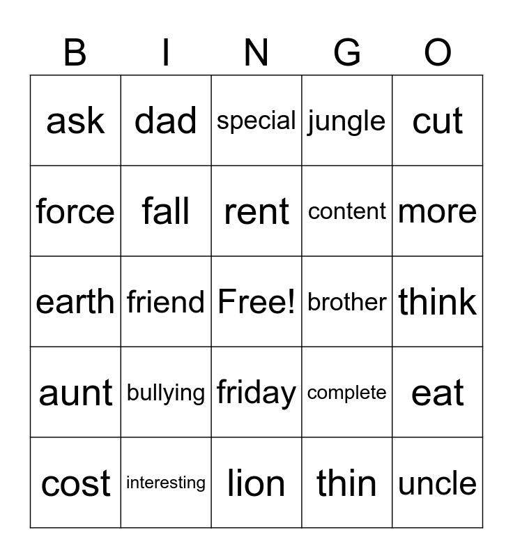 This bingo card has a free space and 24 words: bullying, interesting, rent, cost, cut, ask, force, dad, brother, friday, content, earth, complete, eat, fall, thin, think, special, more, friend, uncle, aunt, jungle and lion.