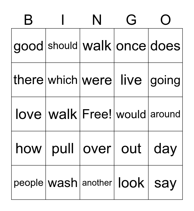 This bingo card has a free space and 24 words: pull, wash, were, people, does, good, there, should, would, over, live, love, out, day, which, look, around, walk, going, walk, say, how, once and another.