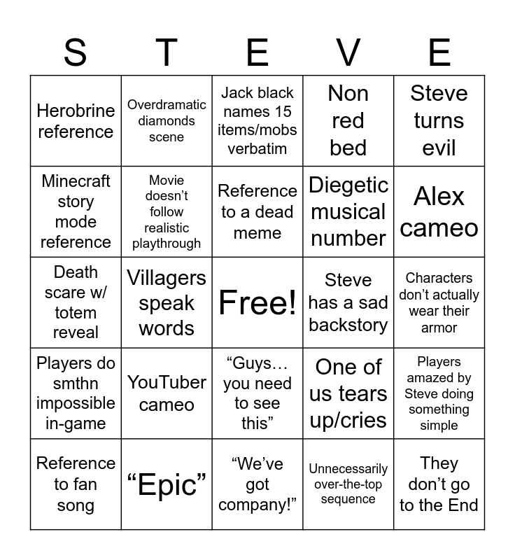 This bingo card has a free space and 24 words: YouTuber cameo, “Epic”, Reference to a dead meme, Reference to fan song, Steve turns evil, Herobrine reference, Minecraft story mode reference, Overdramatic diamonds scene, Steve has a sad backstory, “Guys… you need to see this”, Diegetic musical number, Death scare w/ totem reveal, One of us tears up/cries, Players amazed by Steve doing something simple, Movie doesn’t follow realistic playthrough, Unnecessarily over-the-top sequence, Characters don’t actually wear their armor, Jack black names 15 items/mobs verbatim, Alex cameo, Villagers speak words, They don’t go to the End, Players do smthn impossible in-game, Non red bed and “We’ve got company!”.