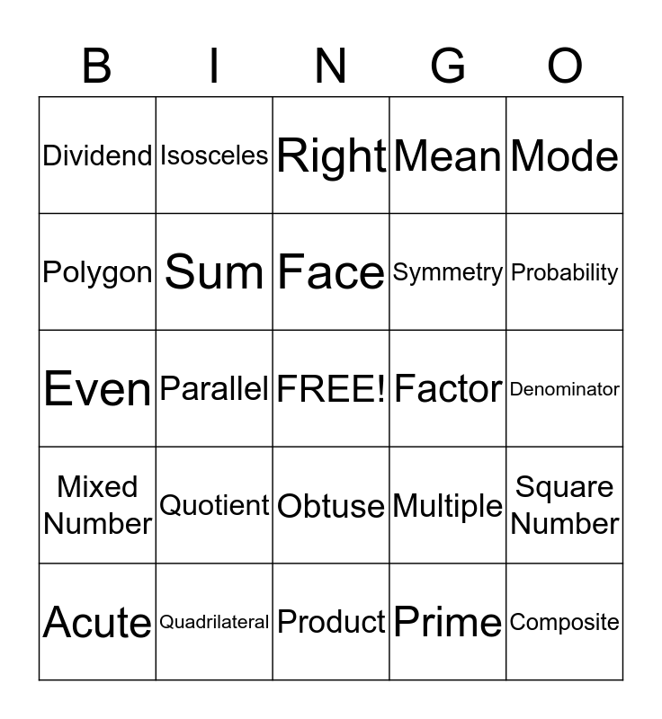 This bingo card has a free space and 24 words: Quotient, Quadrilateral, Face, Acute, Mode, Dividend, Polygon, Isosceles, Factor, Obtuse, Symmetry, Even, Multiple, Square Number, Sum, Prime, Denominator, Right, Probability, Parallel, Composite, Mixed Number, Mean and Product.