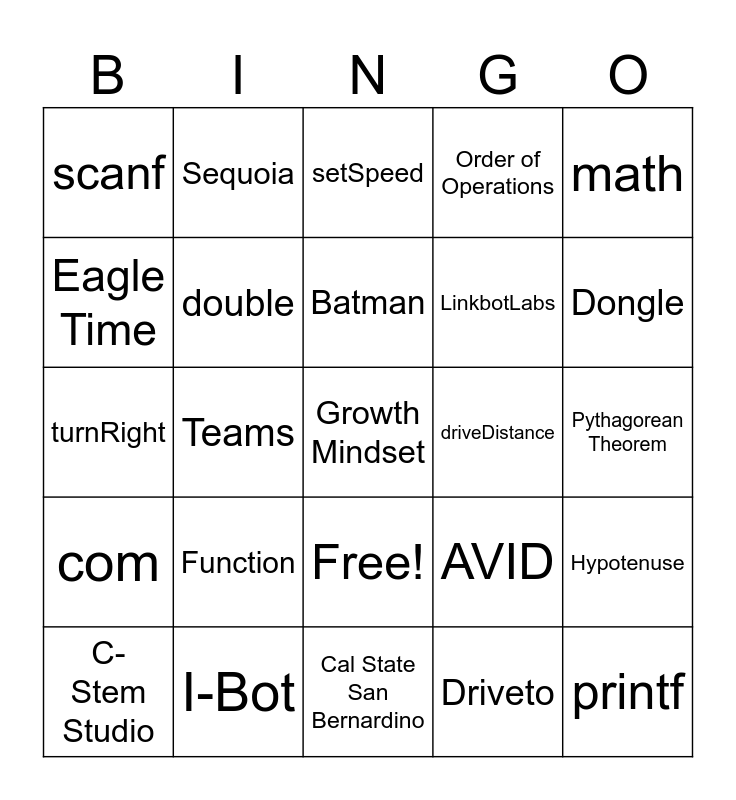 This bingo card has 35 words: Roboblocky, Linkbot, ChIDE, LinkbotLabs, printf, scanf, double, Mr.Brock, driveDistance, turnLeft, turnRight, Sequoia, Free!, coding, math, com, I-Bot, setSpeed, Driveto, Pythagorean Theorem, C-Stem Studio, Teams, Growth Mindset, SOAR, Dongle, Eagle Time, University of LaVerne, Cal State San Bernardino, AVID, Hypotenuse, Rate of Change, Function, Batman, Order of Operations and Integers.