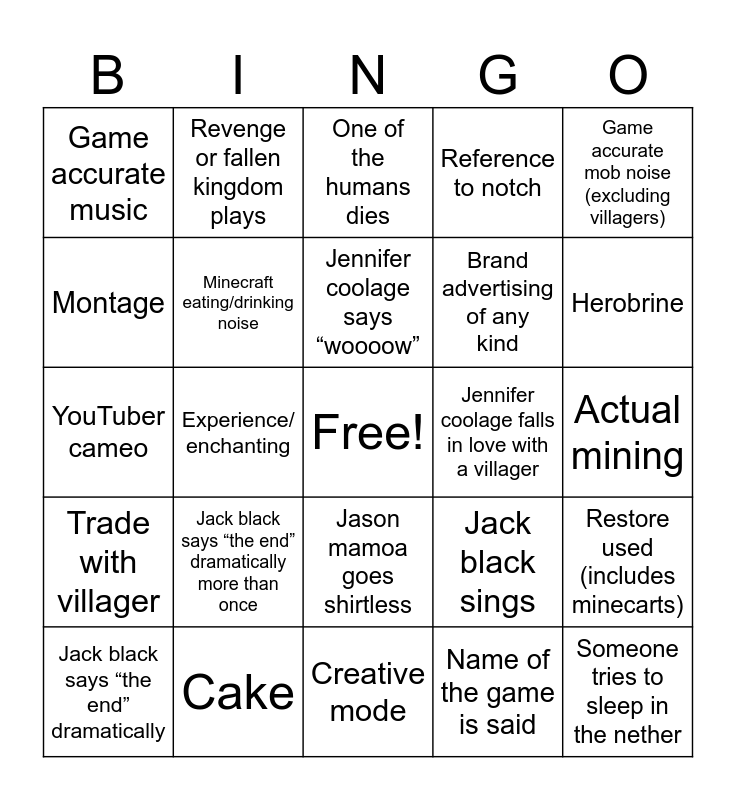 This bingo card has a free space and 24 words: Jack black says “the end” dramatically, Jack black says “the end” dramatically more than once, Jennifer coolage says “woooow”, Name of the game is said, Game accurate mob noise (excluding villagers), Game accurate music, Revenge or fallen kingdom plays, One of the humans dies, Jennifer coolage falls in love with a villager, Actual mining, YouTuber cameo, Minecraft eating/drinking noise, Jack black sings, Restore used (includes minecarts), Montage, Cake, Creative mode, Reference to notch, Herobrine, Trade with villager, Experience/ enchanting, Jason mamoa goes shirtless, Brand advertising of any kind and Someone tries to sleep in the nether.