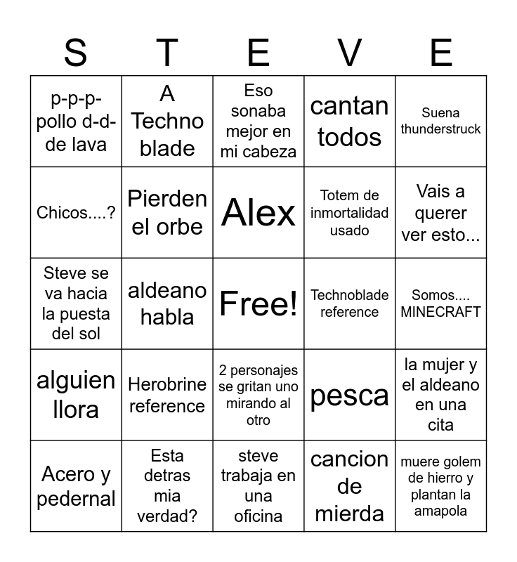 This bingo card has a free space and 24 words: Herobrine reference, Esta detras mia verdad?, Alex, Acero y pedernal, Suena thunderstruck, p-p-p-pollo d-d-de lava, Chicos....?, A Techno blade, Technoblade reference, 2 personajes se gritan uno mirando al otro, Totem de inmortalidad usado, Steve se va hacia la puesta del sol, pesca, la mujer y el aldeano en una cita, Pierden el orbe, cancion de mierda, Somos.... MINECRAFT, Eso sonaba mejor en mi cabeza, Vais a querer ver esto..., aldeano habla, muere golem de hierro y plantan la amapola, alguien llora, cantan todos and steve trabaja en una oficina.