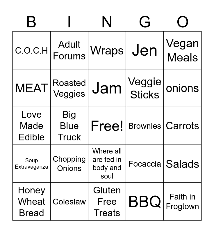 This bingo card has a free space and 55 words: Cleaning out the Freezer Week, Honey Wheat Bread, Eric, C.O.C.H, Gluten Free Treats, Catering Events, Roasted Veggies, Mac N Cheese, Veggie Sticks, Favorite Guests, Jen, Fruit Crisp, Chips, Asian Chicken Slaw, Green Goddess Dressing, Kari, Vegan Meals, Big Blue Truck, 100% Compostable Items!, Faith in Frogtown, Brownies, Volunteer Emails, Focaccia, Wraps, Veggie Meals, Jam, BBQ, Rice and Larpenteur, Carrots, Salads, Chocolate Chip Cookies, Granola, Karleigh, Fruit, MEAT, Love Made Edible, Coffee Breaks, Soup Extravaganza, Tina, Chili, Adult Forums, Scones, Preaching, Half n Half, Chopping Onions, Coleslaw, brownies, Parfaits, Chopping for hours, onions, Lime Juice, Hand pies, Allianz, Where all are fed in body and soul and Pasta Bake.