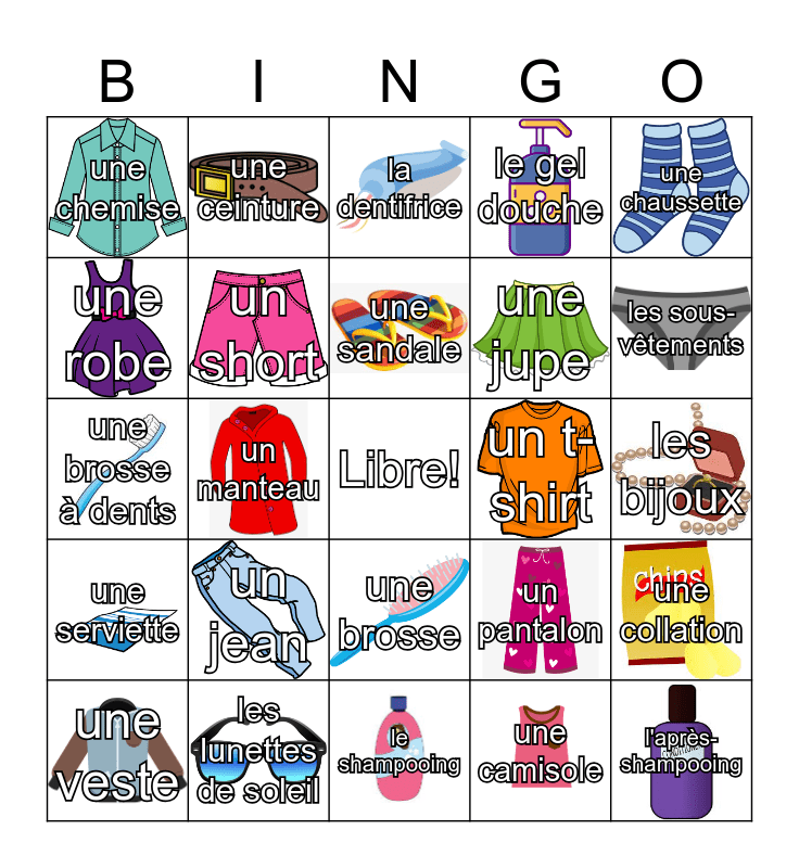This bingo card has 34 images, a free space and 34 words: un appareil photo, une camisole, une bouteille d'eau, les pyjamas, une serviette, un short, une chaussette, une veste, une ceinture, les chaussures, une sandale, la dentifrice, l'écran solaire, un maillot de bain, un t-shirt, les sous-vêtements, les lunettes de soleil, une brosse à dents, un jean, un pantalon, une brosse, un chargeur, une chemise, les bijoux, le shampooing, l'après-shampooing, le gel douche, un kangourou, une jupe, une robe, le maquillage, un manteau, une collation and les bottes.