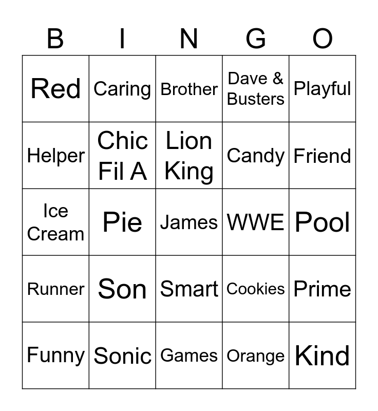 This bingo card has a free space and 29 words: Soccer, Sonic, Brother, Math, Playful, Red, Chic Fil A, Lion King, WWE, Prime, Funny, Pie, Orange, Kind, Ice Cream, Snacks, Games, Cookies, Friend, Runner, Son, Fishing, Candy, Pool, Helper, Caring, Smart, Dave & Busters and Urban Air.