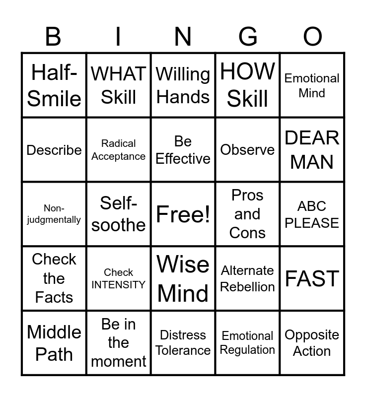 This bingo card has a free space and 31 words: Distress Tolerance, ACCEPTS, Self-soothe, IMPROVE, Half-Smile, Willing Hands, Radical Acceptance, Alternate Rebellion, Pros and Cons, Emotional Regulation, ABC PLEASE, Opposite Action, Identify Emotions, Interpersonal Effectiveness, DEAR MAN, GIVE, FAST, Check INTENSITY, Check the Facts, Wise Mind, Emotional Mind, Rational Mind, Middle Path, WHAT Skill, Observe, Describe, HOW Skill, Non- judgmentally, Be in the moment, Be Effective and Problem Solving.