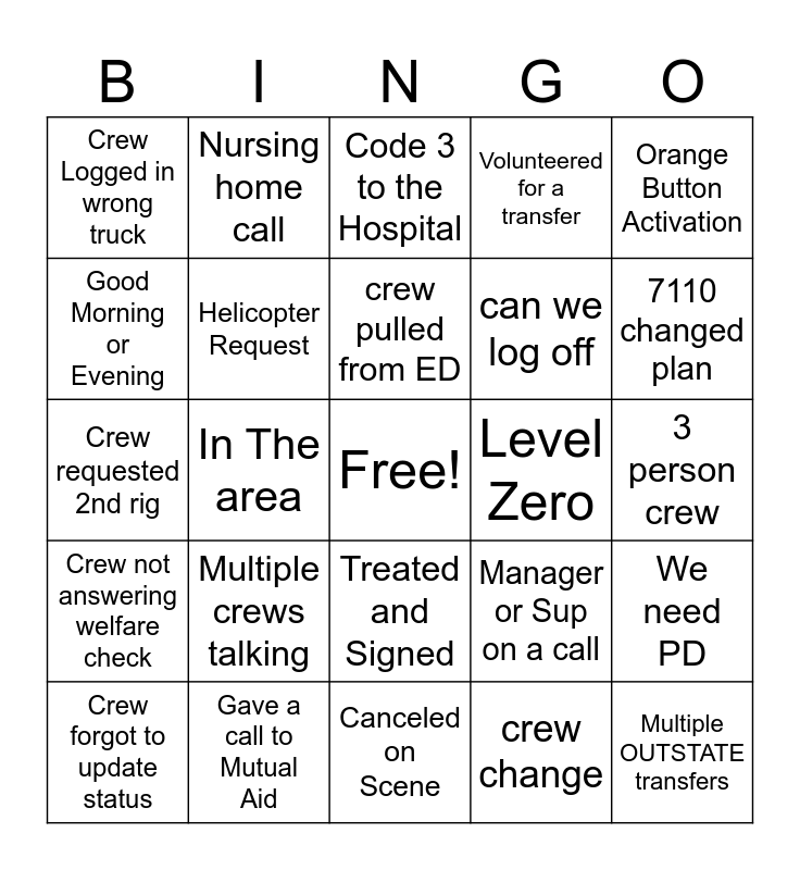 This bingo card has a free space and 34 words: Multiple calls in an area, crew change, code 3 transfer, crew OOS, Crew not answering welfare check, Helicopter Request, Orange Button Activation, Crew forgot to update status, Nursing home call, treated and signed, crew pulled from ED, Code 3 to the Hospital, Crew cleared in, Stand by, Level Zero, 7110 changed plan, Gave a call to Mutual Aid, Crew requested 2nd rig, Multiple crews talking, Manager or Sup on a call, Treated and Signed, ALS doing BLS, Crew Logged in wrong truck, 3 person crew, Canceled on Scene, Multiple OUTSTATE transfers, Volunteered for a transfer, Code 3 transfer, can we log off, Good Morning or Evening, Did an Epic Transfer, In The area, We need PD and Treating a diabetic.