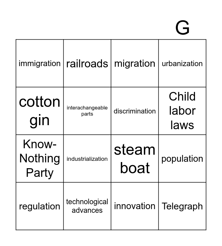 This bingo card has 17 words: innovation, regulation, migration, immigration, industrialization, urbanization, population, discrimination, Child labor laws, interachangeable parts, technological advances, steam boat, cotton gin, railroads, Know-Nothing Party, Erie Canal and Telegraph.