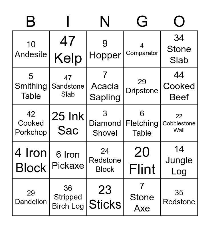 This bingo card has a free space and 24 words: 6 Iron Pickaxe, 36 Stripped Birch Log, 7 Acacia Sapling, 29 Dandelion, 34 Stone Slab, 10 Andesite, 5 Smithing Table, 47 Kelp, 6 Fletching Table, 24 Redstone Block, 29 Dripstone, 42 Cooked Porkchop, 20 Flint, 14 Jungle Log, 47 Sandstone Slab, 7 Stone Axe, 22 Cobblestone Wall, 9 Hopper, 44 Cooked Beef, 25 Ink Sac, 35 Redstone, 4 Iron Block, 4 Comparator and 23 Sticks.