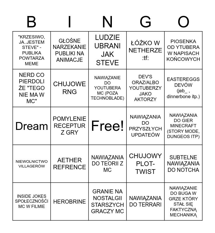 This bingo card has a free space and 24 words: AETHER REFRENCE, HEROBRINE, NAWIĄZANIE DO YOUTUBERA MC (POZA TECHNOBLADE), INSIDE JOKES SPOŁECZNOŚĆI MC W FILMIE, PIOSENKA OD YTUBERA W NAPISACH KOŃCOWYCH, "KRZESIWO, JA..JESTEM STEVE" - PUBLIKA POWTARZA MEME, NERD CO PIERDOLI ŻE "TEGO NIE MA W MC", GŁOŚNE NARZEKANIE PUBLIKI NA ANIMACJE, NAWIĄZANIA DO PRZYSZŁYCH UPDATEÓW, NAWIĄZANIA DO TEORII Z MC, DEV'S ORAZ/ALBO YOUTUBERZY JAKO AKTORZY, Dream, CHUJOWY PLOT-TWIST, SUBTELNE NAWIĄZANIA DO NOTCHA, CHUJOWE RNG, NAWIĄZANIA DO TERRARI, NAWIĄZANIA DO GIER MINECRAFT (STORY MODE, DUNGEOS ITP), LUDZIE UBRANI JAK STEVE, EASTEREGGS DEVÓW (jeb_ , dinnerbone itp.), POMYLENIE RECEPTUR Z GRY, NAWIĄZANIE DO BUGA W GRZE KTÓRY STAŁ SIĘ FAKTYCZNĄ MECHANIKĄ, NIEWOLNICTWO VILLAGERÓW, ŁÓŻKO W NETHERZE :tf: and GRANIE NA NOSTALGII STARSZYCH GRACZY MC.