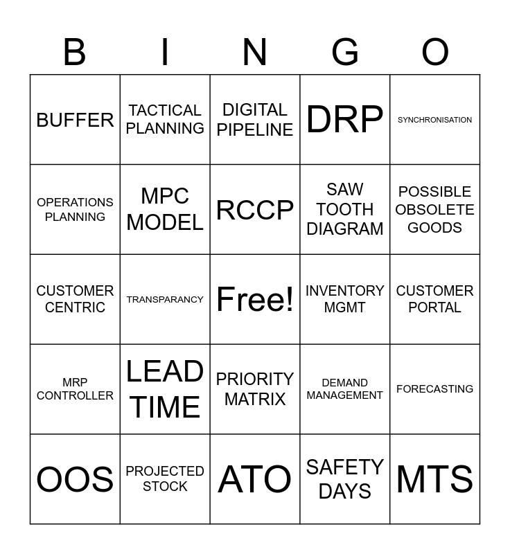 This bingo card has a free space and 46 words: MTO, MTS, ETO, ATO, LEAD TIME, PLANNING HORIZON, TACTICAL PLANNING, STRATEGIC PLANNING, OPERATIONS PLANNING, SHORT TERM PLANNING, MPC MODEL, DRP, FORECASTING, DEMAND MANAGEMENT, MPS, MRP, RCCP, INVENTORY MGMT, STANDARDIZATION, SYNCHRONISATION, TRANSPARANCY, SAFETY DAYS, BUFFER, SAW TOOTH DIAGRAM, LOW TRUST, POSSIBLE OBSOLETE GOODS, OOS, SUPPLIER VARIABILITY PROTECTION, PRIORITY MATRIX, MRP CONTROLLER, Z TABLE, PLANNING WHEEL, TRAFFIC LIGHT, OFFSET COVERAGE, ALERT MONITOR, PROJECTED STOCK, CUSTOMER PORTAL, DIGILAB, TRANSVERSAL PROGRAM, CONNECTED VALUE CHAIN, DATA & ANALYTICS, DIGITAL PIPELINE, CUSTOMER CENTRIC, IMPROVEMENT, TARGET IMAGE and GROWTH.