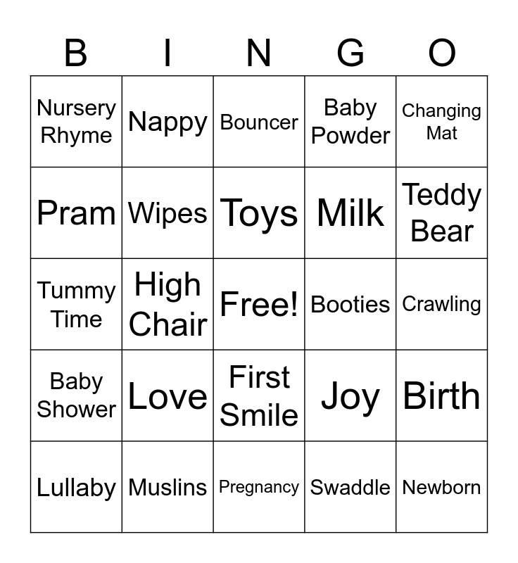 This bingo card has a free space and 53 words: Bottle, Newborn, Baby, Swaddle, Love, Blanket, Nappy, Dummy, Pram, Nursery, Wipes, Rattle, Birth, Joy, Cot, Lullaby, Toys, Booties, Moses Basket, Changing Mat, High Chair, Mobile, Milk, Nursery Rhyme, Blue, Muslins, Teether, Bib, Stork, Teddy Bear, Nap Time, Giggles, Family, Rubber Duck, Bath Time, Scratch Mitts, Baby Powder, Pregnancy, Bouncer, Night Light, Onesie, Playmat, Crawling, Babbling, Crying, First Smile, Labour, Mommies, Tummy Time, Baby Shower, Rattle, Winnie the Pooh and Baby Clothes.