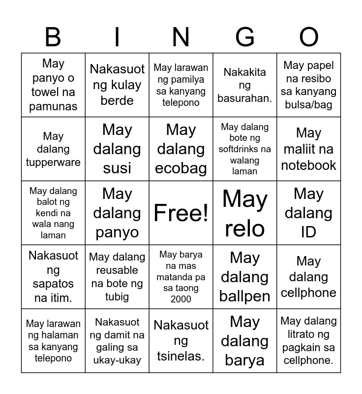 This bingo card has a free space and 24 words: May dalang reusable na bote ng tubig, Nakasuot ng damit na galing sa ukay-ukay, May dalang ecobag, May larawan ng halaman sa kanyang telepono, May papel na resibo sa kanyang bulsa/bag, May panyo o towel na pamunas, May dalang tupperware, Nakasuot ng kulay berde, May relo, May barya na mas matanda pa sa taong 2000, May dalang bote ng softdrinks na walang laman, May dalang balot ng kendi na wala nang laman, May dalang ballpen, May dalang cellphone, May dalang susi, May dalang barya, May dalang ID, May larawan ng pamilya sa kanyang telepono, May maliit na notebook, May dalang panyo, May dalang litrato ng pagkain sa cellphone., Nakasuot ng sapatos na itim., Nakakita ng basurahan. and Nakasuot ng tsinelas..