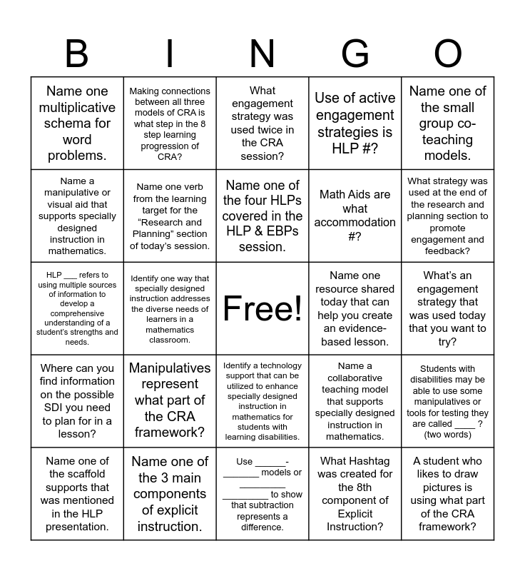 This bingo card has a free space and 24 words: Manipulatives represent what part of the CRA framework?, Name one of the 3 main components of explicit instruction., Name one of the four HLPs covered in the HLP & EBPs session., Name one of the scaffold supports that was mentioned in the HLP presentation., Name one of the small group co-teaching models., Name one multiplicative schema for word problems., Name a manipulative or visual aid that supports specially designed instruction in mathematics., Making connections between all three models of CRA is what step in the 8 step learning progression of CRA?, Name one resource shared today that can help you create an evidence-based lesson., Identify a technology support that can be utilized to enhance specially designed instruction in mathematics for students with learning disabilities., Math Aids are what accommodation #?, HLP ___ refers to using multiple sources of information to develop a comprehensive understanding of a student’s strengths and needs., Name a collaborative teaching model that supports specially designed instruction in mathematics., Students with disabilities may be able to use some manipulatives or tools for testing they are called ____ ? (two words), Name one verb from the learning target for the “Research and Planning” section of today’s session., What Hashtag was created for the 8th component of Explicit Instruction?, What’s an engagement strategy that was used today that you want to try?, What engagement strategy was used twice in the CRA session?, What strategy was used at the end of the research and planning section to promote engagement and feedback?, Identify one way that specially designed instruction addresses the diverse needs of learners in a mathematics classroom., A student who likes to draw pictures is using what part of the CRA framework?, Where can you find information on the possible SDI you need to plan for in a lesson?, Use of active engagement strategies is HLP #? and Use ______-_______ models or _________ _________ to show that subtraction represents a difference..