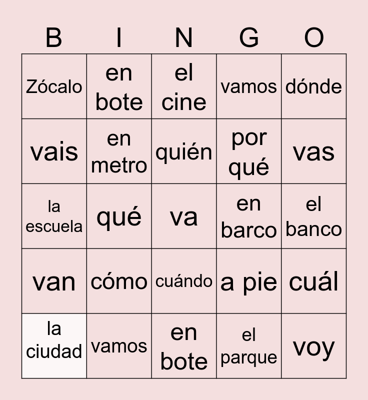 This bingo card has a free space and 29 words: la ciudad, a caballo, qué, la biblioteca, Zócalo, el cine, en metro, cómo, en barco, vamos, el banco, voy, en bote, el parque, vas, en bicicleta, cuándo, van, dónde, la escuela, a pie, cuántos, por qué, vais, vamos, en bote, cuál, quién and en moto.
