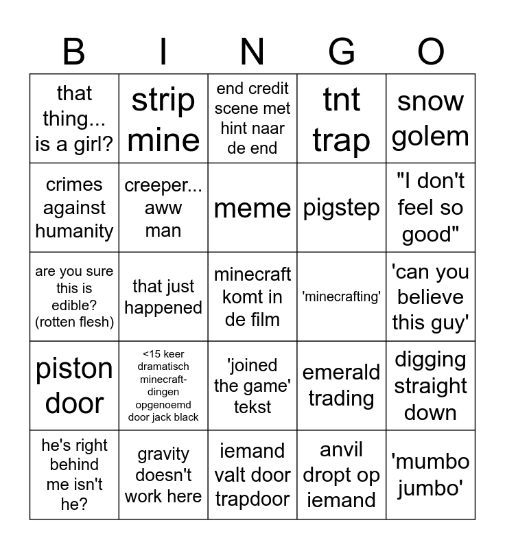 This bingo card has a free space and 29 words: he's right behind me isn't he?, minecraft youtuber reference, that just happened, iemand respawned, that thing... is a girl?, end credit scene met hint naar de end, creeper... aww man, <15 keer dramatisch minecraft-dingen opgenoemd door jack black, 'minecrafting', gravity doesn't work here, 'can you believe this guy', 'mumbo jumbo', iemand valt door trapdoor, anvil dropt op iemand, "I don't feel so good", hunger bar -> kan niet meer lopen, 'joined the game' tekst, piston door, snow golem, are you sure this is edible? (rotten flesh), emerald trading, slaan tegen bomen, pigstep, crimes against humanity, tnt trap, strip mine, digging straight down, meme and herobrine.