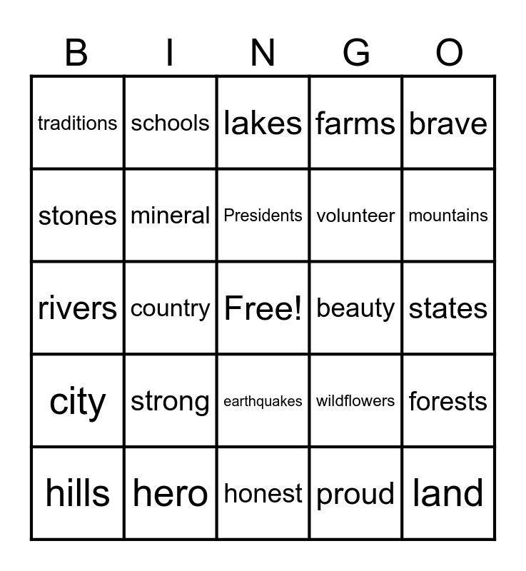 This bingo card has a free space and 24 words: strong, hero, Presidents, hills, brave, traditions, stones, schools, beauty, earthquakes, volunteer, rivers, wildflowers, forests, mineral, proud, states, lakes, mountains, country, land, city, farms and honest.