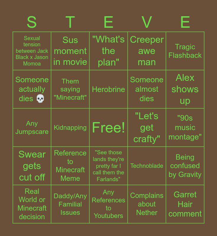 This bingo card has a free space and 31 words: Any References to Youtubers, Miners!!!, Kidnapping, Jennifer Coolidge making out with villager, Sexual tension between Jack Black x Jason Momoa, "What's the plan", Them saying "Minecraft", Technoblade, "Let's get crafty", Complains about Nether, "90s music montage", Garret Hair comment, Pet dies, Black woman having too much fun killing stuff, Alex shows up, "Get in the minecart", Being confused by Gravity, Reference to Minecraft Meme, Swear gets cut off, "See those lands they're pretty far I call them the Farlands", Tragic Flashback, Reference outside of Minecraft Movie, Real World or Minecraft decision, Sus moment in movie, Someone almost dies, Someone actually dies 💀, Creeper awe man, Any Jumpscare, Daddy/Any Familial Issues, Herobrine and Steve exposition.