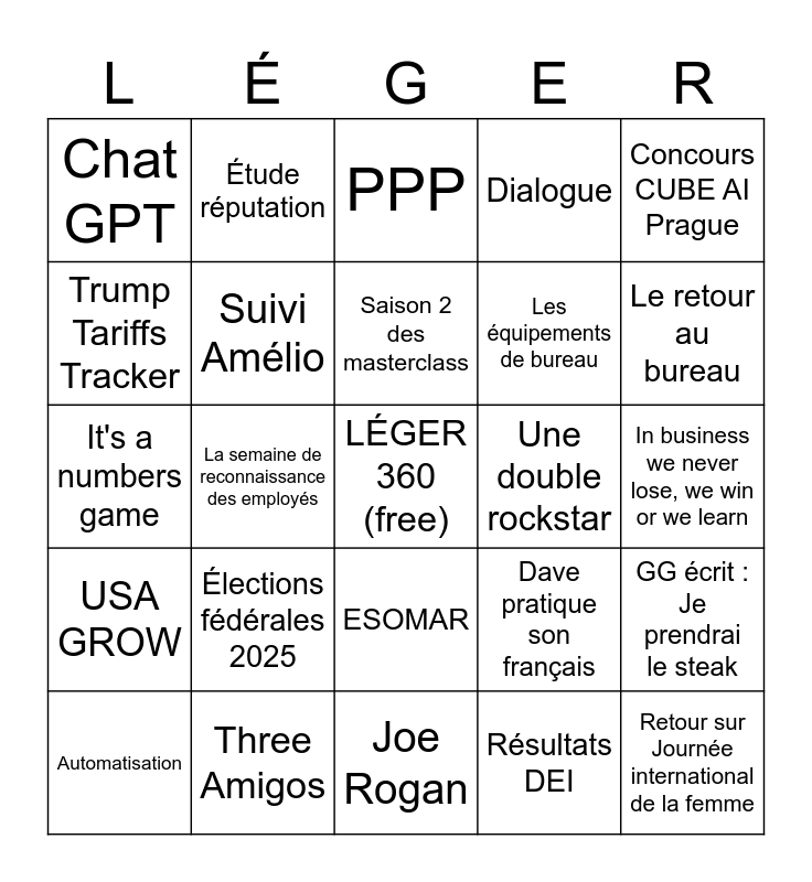 This bingo card has a free space and 24 words: Élections fédérales 2025, Three Amigos, Saison 2 des masterclass, Automatisation, Concours CUBE AI Prague, Chat GPT, Trump Tariffs Tracker, Étude réputation, Une double rockstar, ESOMAR, Les équipements de bureau, It's a numbers game, Dave pratique son français, GG écrit : Je prendrai le steak, Suivi Amélio, Résultats DEI, In business we never lose, we win or we learn, PPP, Le retour au bureau, La semaine de reconnaissance des employés, Retour sur Journée international de la femme, USA GROW, Dialogue and Joe Rogan.