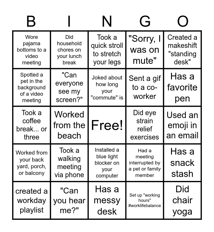 This bingo card has a free space and 24 words: Took a walking meeting via phone, "Can you hear me?", Joked about how long your "commute" is, created a workday playlist, Created a makeshift "standing desk", Wore pajama bottoms to a video meeting, Spotted a pet in the background of a video meeting, Did household chores on your lunch break, Did eye strain relief exercises, Installed a blue light blocker on your computer, Sent a gif to a co-worker, Took a coffee break... or three, Had a meeting interrupted by a pet or family member, Has a snack stash, "Can everyone see my screen?", Set up "working hours" #worklifebalance, Used an emoji in an email, Took a quick stroll to stretch your legs, Has a favorite pen, Worked from the beach, Did chair yoga, Worked from your back yard, porch, or balcony, "Sorry, I was on mute" and Has a messy desk.