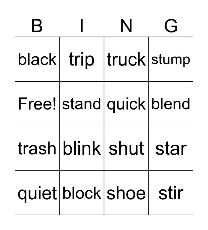 This bingo card has 16 words: block, star, truck, black, trash, trip, shut, shoe, Free!, stand, quiet, stump, blink, blend, quick and stir.