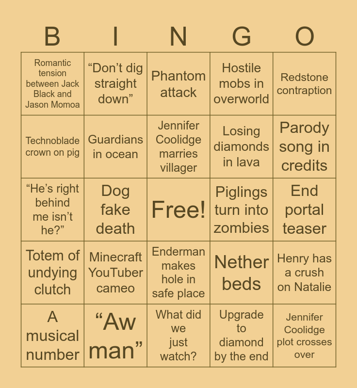 This bingo card has a free space and 24 words: Minecraft YouTuber cameo, “Aw man”, Jennifer Coolidge marries villager, A musical number, Redstone contraption, Romantic tension between Jack Black and Jason Momoa, Technoblade crown on pig, “Don’t dig straight down”, Piglings turn into zombies, Enderman makes hole in safe place, Losing diamonds in lava, “He’s right behind me isn’t he?”, Nether beds, Henry has a crush on Natalie, Guardians in ocean, Upgrade to diamond by the end, End portal teaser, Phantom attack, Parody song in credits, Dog fake death, Jennifer Coolidge plot crosses over, Totem of undying clutch, Hostile mobs in overworld and What did we just watch?.