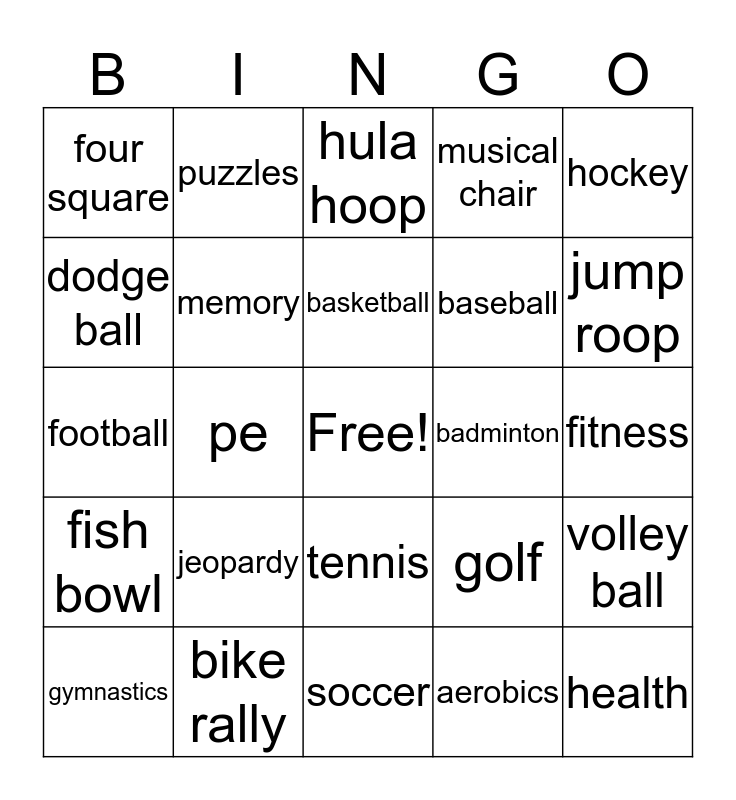 This bingo card has a free space and 24 words: jeopardy, bike rally, basketball, gymnastics, hockey, four square, dodge ball, puzzles, badminton, tennis, baseball, football, golf, volley ball, memory, aerobics, fitness, hula hoop, jump roop, pe, health, fish bowl, musical chair and soccer.