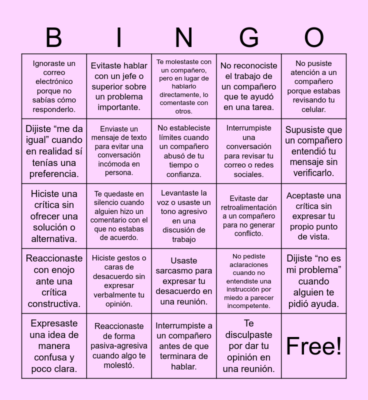 This bingo card has 31 words: Interrumpiste a un compañero antes de que terminara de hablar., Evitaste dar tu opinión en una reunión por miedo a ser juzgado., Te quedaste en silencio cuando alguien hizo un comentario con el que no estabas de acuerdo., Dijiste “sí” a una tarea adicional, aunque no tenías tiempo para hacerla., Ignoraste un correo electrónico porque no sabías cómo responderlo., Te molestaste con un compañero, pero en lugar de hablarlo directamente, lo comentaste con otros., Enviaste un mensaje de texto para evitar una conversación incómoda en persona., No pediste aclaraciones cuando no entendiste una instrucción por miedo a parecer incompetente., Evitaste dar retroalimentación a un compañero para no generar conflicto., Te disculpaste por dar tu opinión en una reunión., Aceptaste una crítica sin expresar tu propio punto de vista., Levantaste la voz o usaste un tono agresivo en una discusión de trabajo, Free!, Hiciste una broma en el trabajo que incomodó a alguien., Supusiste que un compañero entendió tu mensaje sin verificarlo., No miraste a los ojos a tu interlocutor durante una conversación importante., Dijiste “no es mi problema” cuando alguien te pidió ayuda., Hiciste gestos o caras de desacuerdo sin expresar verbalmente tu opinión., Reaccionaste con enojo ante una crítica constructiva., Usaste sarcasmo para expresar tu desacuerdo en una reunión., No pusiste atención a un compañero porque estabas revisando tu celular., Dejaste un mensaje sin responder durante varios días., Expresaste una idea de manera confusa y poco clara., Evitaste hablar con un jefe o superior sobre un problema importante., Interrumpiste una conversación para revisar tu correo o redes sociales., Dijiste “me da igual” cuando en realidad sí tenías una preferencia., No reconociste el trabajo de un compañero que te ayudó en una tarea., Hiciste una crítica sin ofrecer una solución o alternativa., Reaccionaste de forma pasiva-agresiva cuando algo te molestó., No estableciste límites cuando un compañero abusó de tu tiempo o confianza. and Te retiraste de una conversación importante sin dar explicaciones..