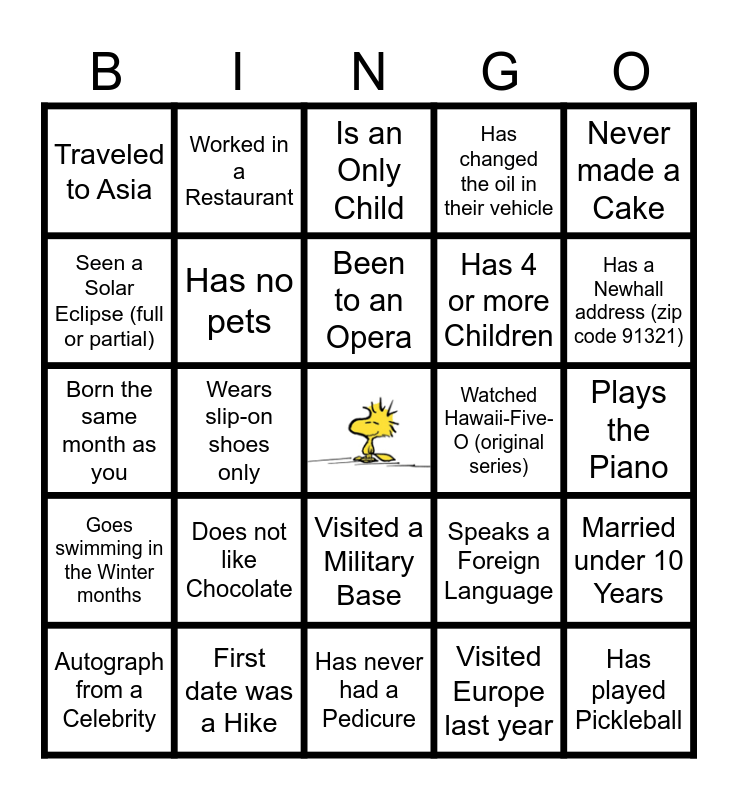 This bingo card has a free space and 24 words: Does not like Chocolate, First date was a Hike, Been to an Opera, Autograph from a Celebrity, Never made a Cake, Traveled to Asia, Seen a Solar Eclipse (full or partial), Worked in a Restaurant, Watched Hawaii-Five-O (original series), Visited a Military Base, Has 4 or more Children, Born the same month as you, Speaks a Foreign Language, Married under 10 Years, Has no pets, Visited Europe last year, Plays the Piano, Is an Only Child, Has a Newhall address (zip code 91321), Wears slip-on shoes only, Has played Pickleball, Goes swimming in the Winter months, Has changed the oil in their vehicle and Has never had a Pedicure.