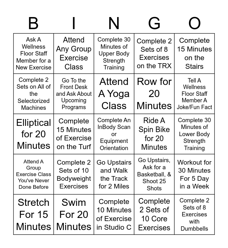 This bingo card has a free space and 24 words: Complete 2 Sets of 10 Bodyweight Exercises, Swim For 20 Minutes, Attend A Yoga Class, Stretch For 15 Minutes, Complete 15 Minutes on the Stairs, Ask A Wellness Floor Staff Member for a New Exercise, Complete 2 Sets on All of the Selectorized Machines, Attend Any Group Exercise Class, Ride A Spin Bike for 20 Minutes, Go Upstairs and Walk the Track for 2 Miles, Row for 20 Minutes, Elliptical for 20 Minutes, Go Upstairs, Ask for a Basketball, & Shoot 25 Shots, Workout for 30 Minutes For 5 Day in a Week, Go To the Front Desk and Ask About Upcoming Programs, Complete 2 Sets of 10 Core Exercises, Complete 30 Minutes of Lower Body Strength Training, Complete 30 Minutes of Upper Body Strength Training, Tell A Wellness Floor Staff Member A Joke/Fun Fact, Complete 15 Minutes of Exercise on the Turf, Complete 2 Sets of 8 Exercises with Dumbbells, Attend A Group Exercise Class You've Never Done Before, Complete 2 Sets of 8 Exercises on the TRX and Complete 10 Minutes of Exercise in Studio C.