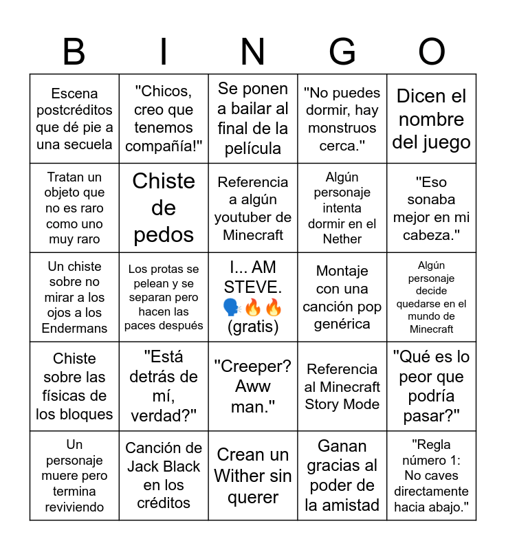 This bingo card has a free space and 24 words: ''Está detrás de mí, verdad?'', Canción de Jack Black en los créditos, Referencia a algún youtuber de Minecraft, Un personaje muere pero termina reviviendo, Dicen el nombre del juego, Escena postcréditos que dé pie a una secuela, Tratan un objeto que no es raro como uno muy raro, ''Chicos, creo que tenemos compañía!'', Montaje con una canción pop genérica, ''Creeper? Aww man.'', Algún personaje intenta dormir en el Nether, Un chiste sobre no mirar a los ojos a los Endermans, Referencia al Minecraft Story Mode, ''Qué es lo peor que podría pasar?'', Chiste de pedos, Ganan gracias al poder de la amistad, Algún personaje decide quedarse en el mundo de Minecraft, Se ponen a bailar al final de la película, ''Eso sonaba mejor en mi cabeza.'', Los protas se pelean y se separan pero hacen las paces después, ''Regla número 1: No caves directamente hacia abajo.'', Chiste sobre las físicas de los bloques, ''No puedes dormir, hay monstruos cerca.'' and Crean un Wither sin querer.