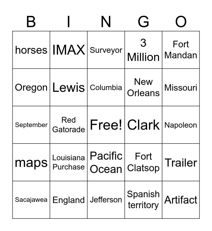 This bingo card has a free space and 29 words: Sacajawea, Rocky Mountains, Red Gatorade, France, horses, Surveyor, Lewis, Louisiana Purchase, Clark, England, Napoleon, Artifact, Jefferson, Spanish territory, Missouri, North Dakota, Pacific Ocean, maps, Fort Mandan, September, Fort Clatsop, Atlantic Ocean, New Orleans, Oregon, 3 Million, IMAX, Trailer, Columbia and Botany.