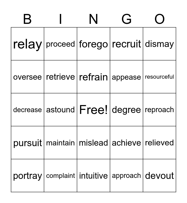 This bingo card has a free space and 24 words: maintain, complaint, refrain, portray, dismay, relay, oversee, proceed, degree, mislead, appease, decrease, achieve, relieved, retrieve, approach, reproach, forego, resourceful, astound, devout, pursuit, recruit and intuitive.