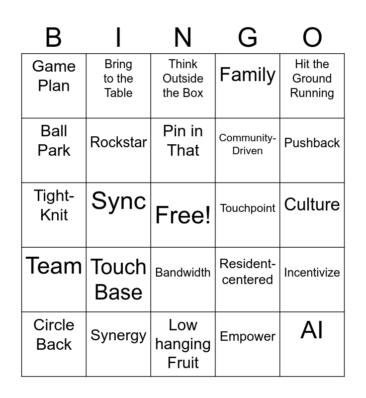 This bingo card has a free space and 24 words: Touch Base, Synergy, Pin in That, Circle Back, Hit the Ground Running, Game Plan, Ball Park, Bring to the Table, Touchpoint, Bandwidth, Community-Driven, Tight-Knit, Resident-centered, Incentivize, Rockstar, Empower, Culture, Think Outside the Box, Pushback, Sync, AI, Team, Family and Low hanging Fruit.