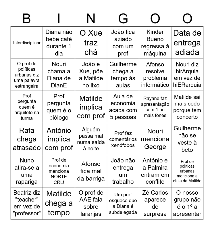 This bingo card has 36 words: João não entrega um trabalho, Afonso fica mal da barriga, Um prof esquece que a Diana é subdelegada, O prof de políticas urbanas diz uma palavra estrangeira, Rafa chega atrasado, Aula de economia acaba com 5 pessoas, Nouri chama a Diana de DianE, O prof de AAE fala sobre laranjas, Kinder Bueno regressa à máquina, António e a Palmira entram em conflito, Nouri diz hirArquia em vez de hiERarquia, João fica aziado com um prof, Prof de políticas urbanas menciona a etnia da Matilde, Prof pergunta quem é o biólogo, Guilherme chega a tempo às aulas, Interdisciplinar, Nuno atira-se a uma rapariga, Rayane faz apresentação com 1 ou mais fones, Prof pergunta quem é arquiteto na turma, O Xue traz chá, Matilde implica com prof, António implica com prof, Prof faz comentários xenófobos, Alguém passa mal numa saída à noite, Nouri menciona George, Diana não bebe café durante 1 dia, Afonso resolve problema informático, Matilde chega a tempo, João e Xue, põe a Matilde no lixo, Data de entrega adiada, O nosso grupo não é o 1º a apresentar, Beatriz diz "teacher" em vez de "professor", Guilherme não se veste à beto, Matilde sai mais cedo porque tem concerto, Prof de economia menciona NORTE CRL! and Zé Carlos aparece de surpresa.