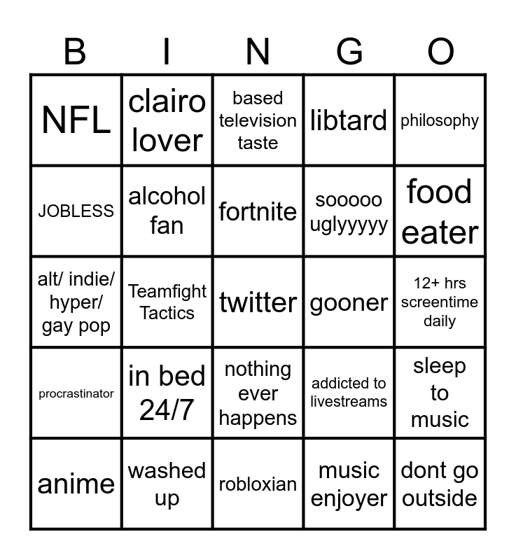 This bingo card has a free space and 24 words: in bed 24/7, washed up, fortnite, anime, philosophy, NFL, JOBLESS, clairo lover, gooner, nothing ever happens, sooooo uglyyyyy, alt/ indie/ hyper/ gay pop, addicted to livestreams, sleep to music, alcohol fan, music enjoyer, 12+ hrs screentime daily, based television taste, food eater, Teamfight Tactics, dont go outside, procrastinator, libtard and robloxian.