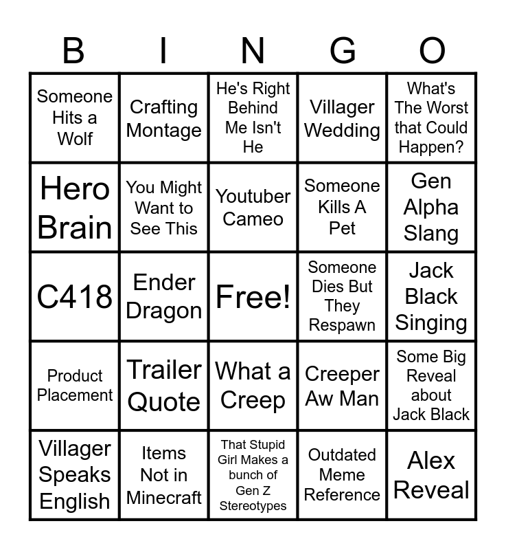 This bingo card has a free space and 24 words: Villager Speaks English, Trailer Quote, Youtuber Cameo, Outdated Meme Reference, What's The Worst that Could Happen?, Someone Hits a Wolf, Crafting Montage, He's Right Behind Me Isn't He, Someone Dies But They Respawn, Jack Black Singing, C418, You Might Want to See This, Creeper Aw Man, Some Big Reveal about Jack Black, Hero Brain, Items Not in Minecraft, That Stupid Girl Makes a bunch of Gen Z Stereotypes, Villager Wedding, Gen Alpha Slang, Product Placement, Ender Dragon, What a Creep, Someone Kills A Pet and Alex Reveal.