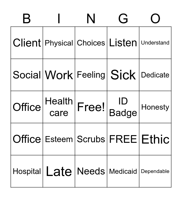 This bingo card has a free space and 25 words: Esteem, Needs, Feeling, Hospital, Understand, Client, Social, Physical, ID Badge, Scrubs, Sick, Office, FREE, Ethic, Work, Attitude, Honesty, Choices, Dedicate, Health care, Dependable, Late, Office, Listen and Medicaid.